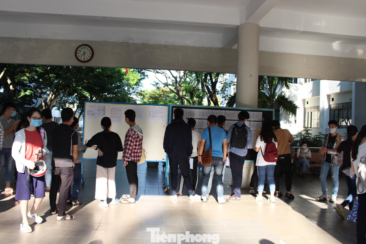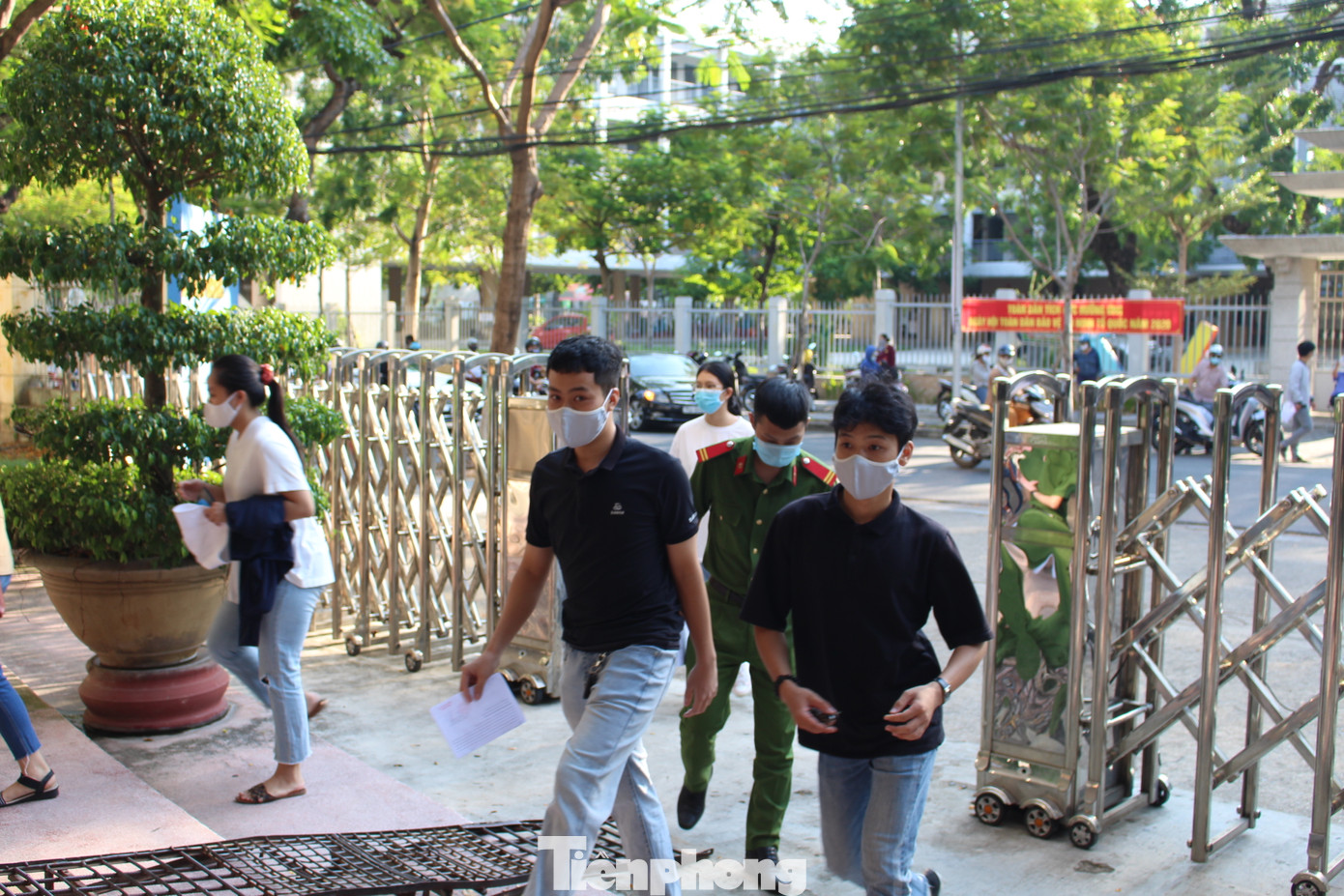 Tại điểm thi THPT Phan Châu Trinh, phòng thi được bố trí ở 1 khu vực riêng, điểm lấy mẫu được bố trí ở 1 khu vực riêng. Sau khi vào phòng kiểm tra thông tin và điền phiếu lấy mẫu, khai báo y tế, thí sinh sẽ di chuyển đến khu vực xét nghiệm. Ảnh: Giang Thanh