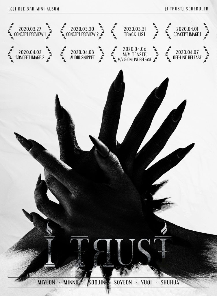 Bìa mini-album I Trust. Mini-album I Trust chứa tổng cộng 5 ca khúc gồm Oh My God, Luv U, Maybe, LION và Oh My God (bản tiếng Anh). Soyeon tham gia viết nhạc và lời cho cả mini-album này. Trong đó, LION đã lên sóng trước vào cuối năm ngoái và được đón nhận nhiệt tình. Lời bài hát nói về cuộc đời của một nàng sư tử sinh ra với ngôi vị Nữ hoàng đẳng cấp và cá tính, trải qua nhiều đau khổ nhưng vẫn luôn xinh đẹp và mạnh mẽ.