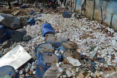 Hàng chục thùng phuy và hàng ngàn lọ nhựa chứa các loại hoá chất văng khắp nơi.