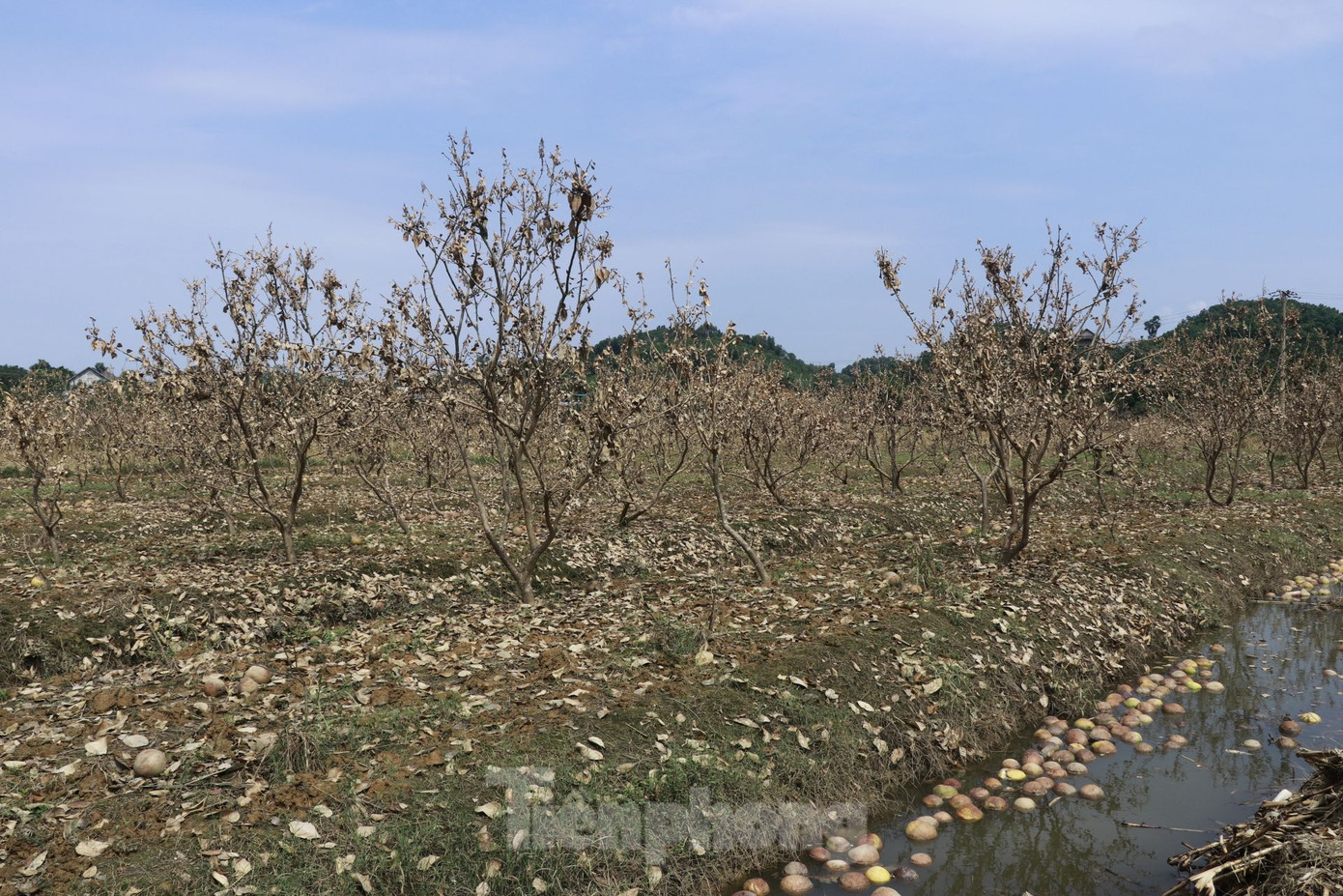 Những quả bưởi bị úng nước nằm la liệt dưới các gốc cây, nằm rải rác khắp các vườn.