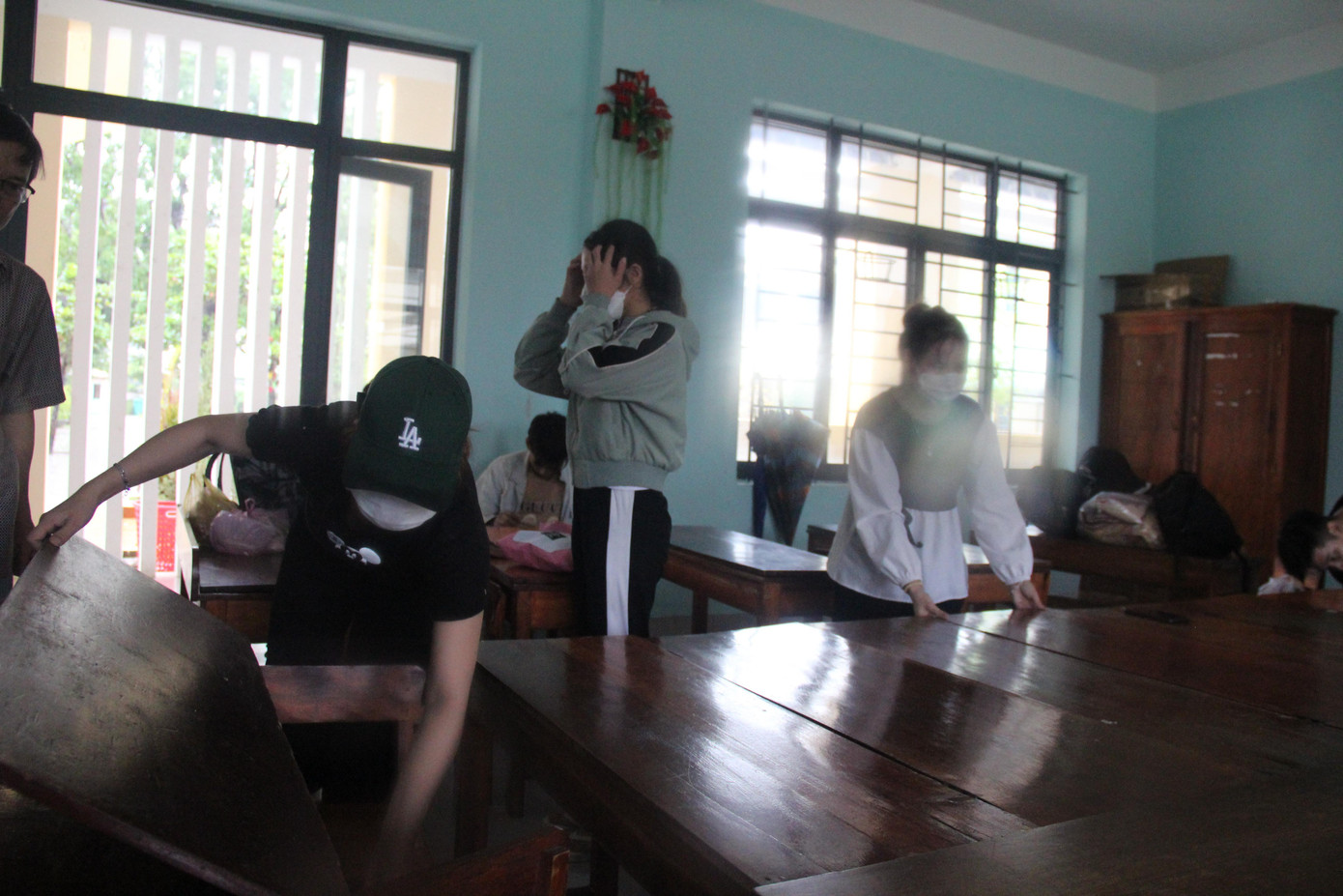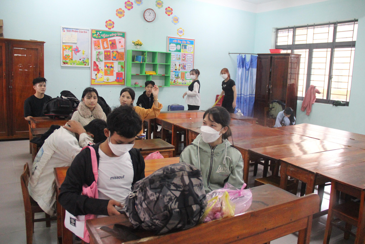 Tại đây các lực lượng chức năng trưng dụng các phòng học kiên cố để các công nhân ở lại qua đêm, chờ khi bão tan.