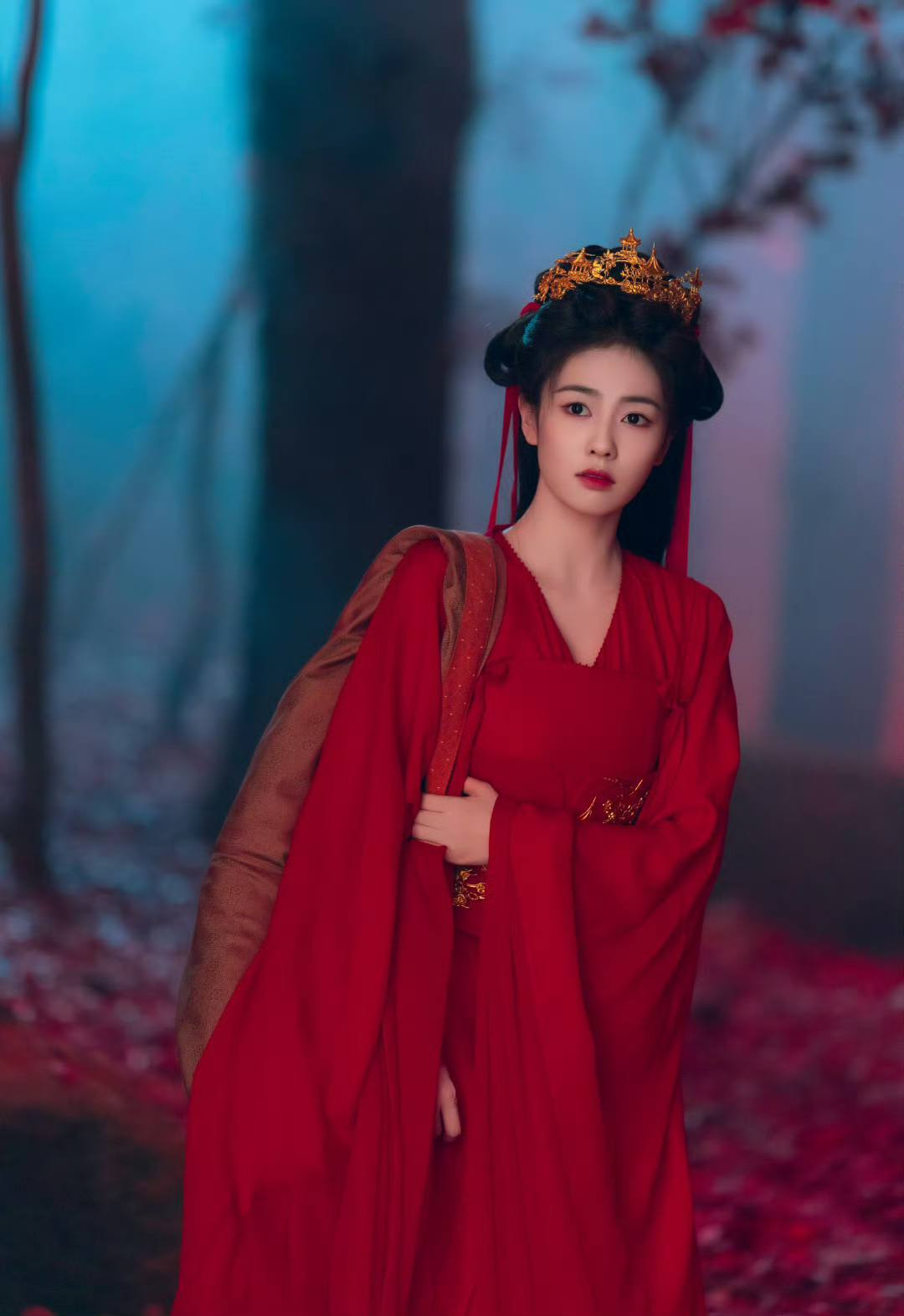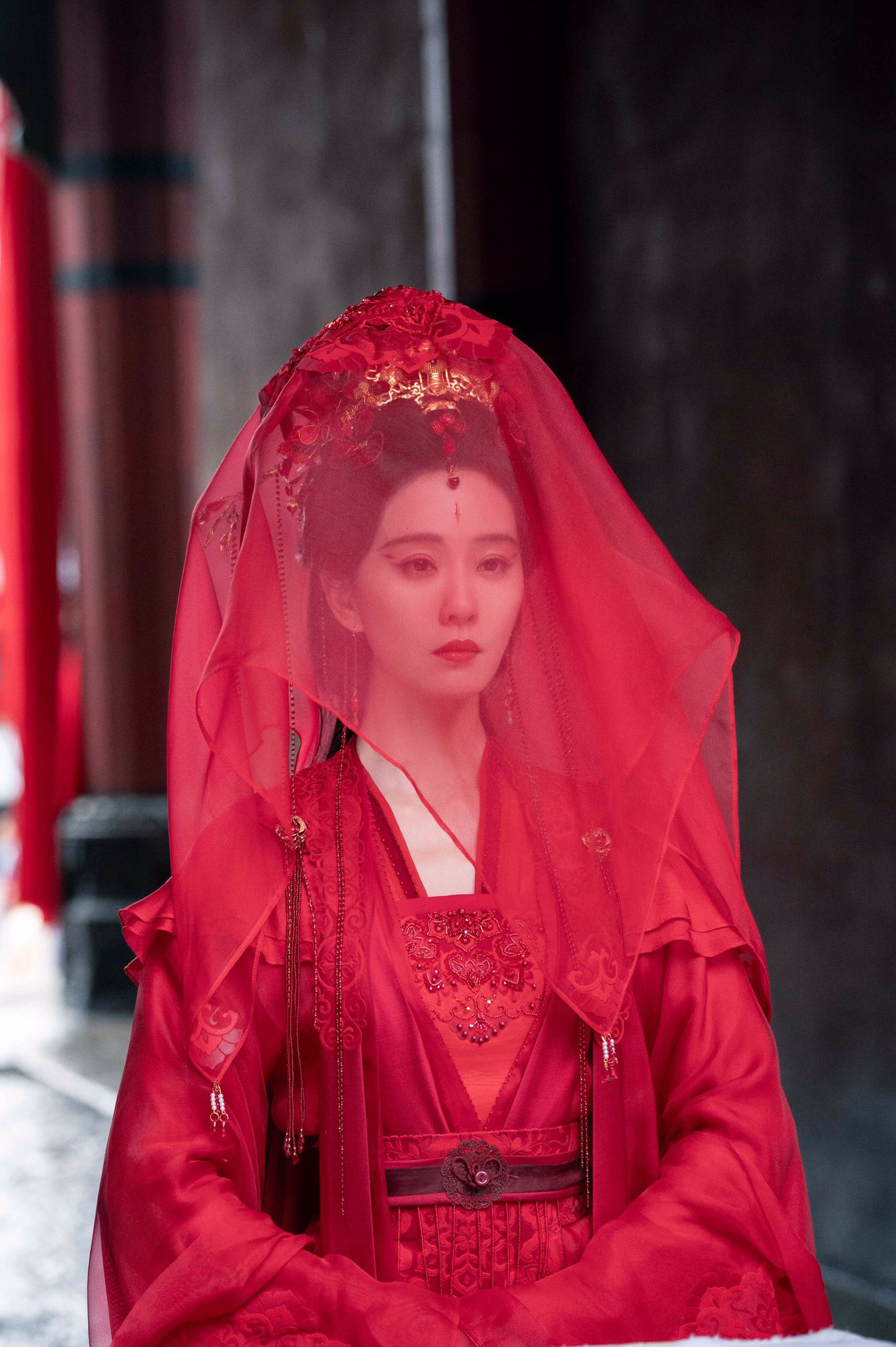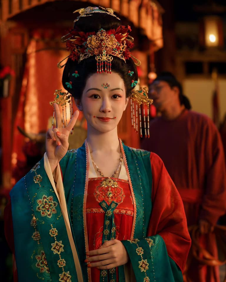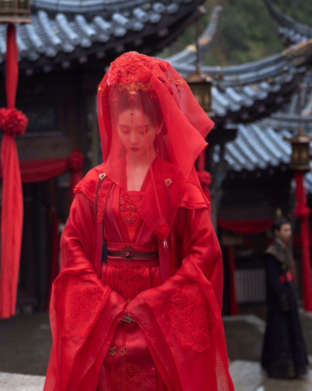 Quốc Sắc Phương Hoa là phim cổ trang ăn khách hồi đầu năm 2025 và kết thúc bằng đám cưới “nửa thật nửa hư” của hai nhân vật chính. Dương Tử đã có tạo hình tân nương đầy độc đáo mặc trang phục mang hai màu xanh và đỏ, dùng trâm cài hết sức tinh xảo.