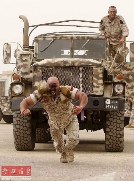 Một số lính biệt kích khác chọn cách thể hiện sức mạnh bằng việc kéo một xe bọc thép lớn chỉ bằng sợi dây thừng nhỏ quấn quanh vai.