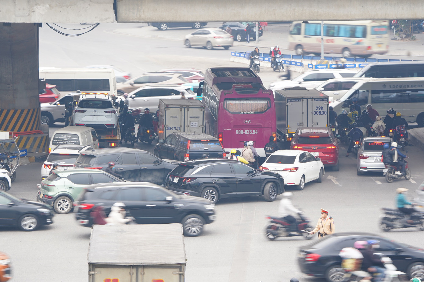 Phương tiện đông bất thường dịp cận tết; những ngày này dù là cuối tuần giao thông tại đây vẫn không tránh khỏi cảnh ùn ứ, nhiều ôtô "chôn chân" tại lối xuống từ đường vành đai 3 trên cao.
