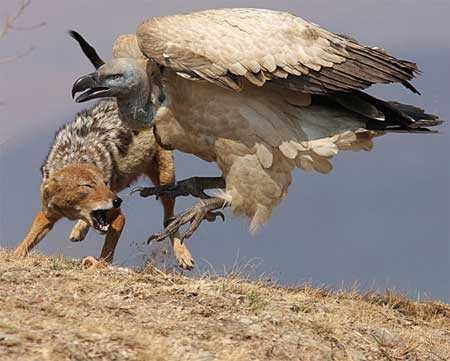 Khi con chó rừng đang lang thang đi kiếm mồi thì nó phát hiện ra một con kền kền đang đứng gần đó. Nó liền lao tới tấn công.