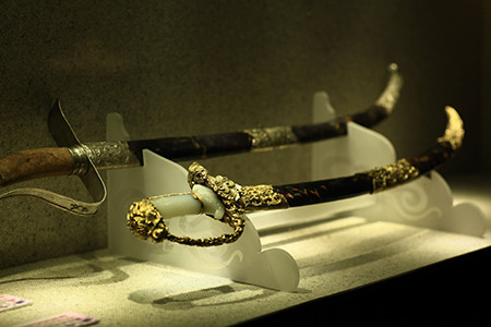Kiếm triều Nguyễn trang trí hoa sen cách điệu được làm bằng ngọc, vàng và đồi mồi.