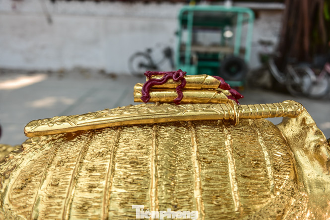 Điểm khác biệt là trên lưng “cụ rùa" có thanh gươm và 1 cuốn binh thư phỏng theo truyền thuyết Lê Lợi trả gươm.