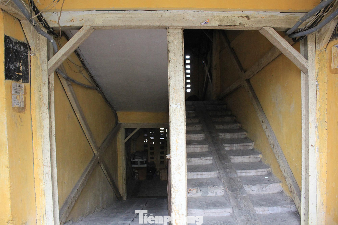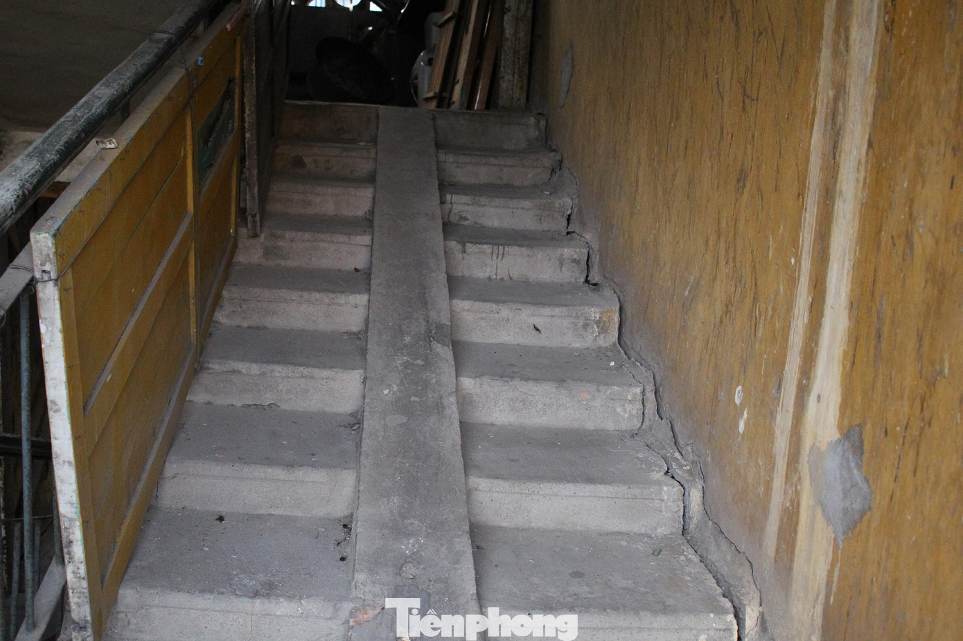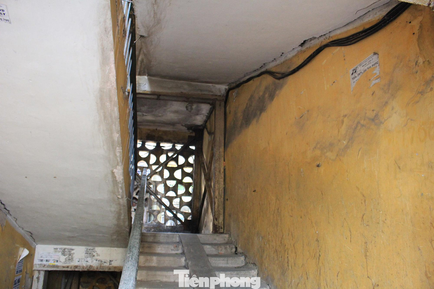 | Tất cả phần chân tường ở cầu thang lên xuống trong nhà A tập thể Ngọc Khánh đều có vết nứt toác thành rãnh chạy dài và lan rộng từng ngày, lan can cầu thang hoen gỉ, gẫy mục từ lâu, có nơi cư dân phải để cánh cửa gỗ thế chỗ cho lan can để có chỗ bám víu khi lên xuống. |
