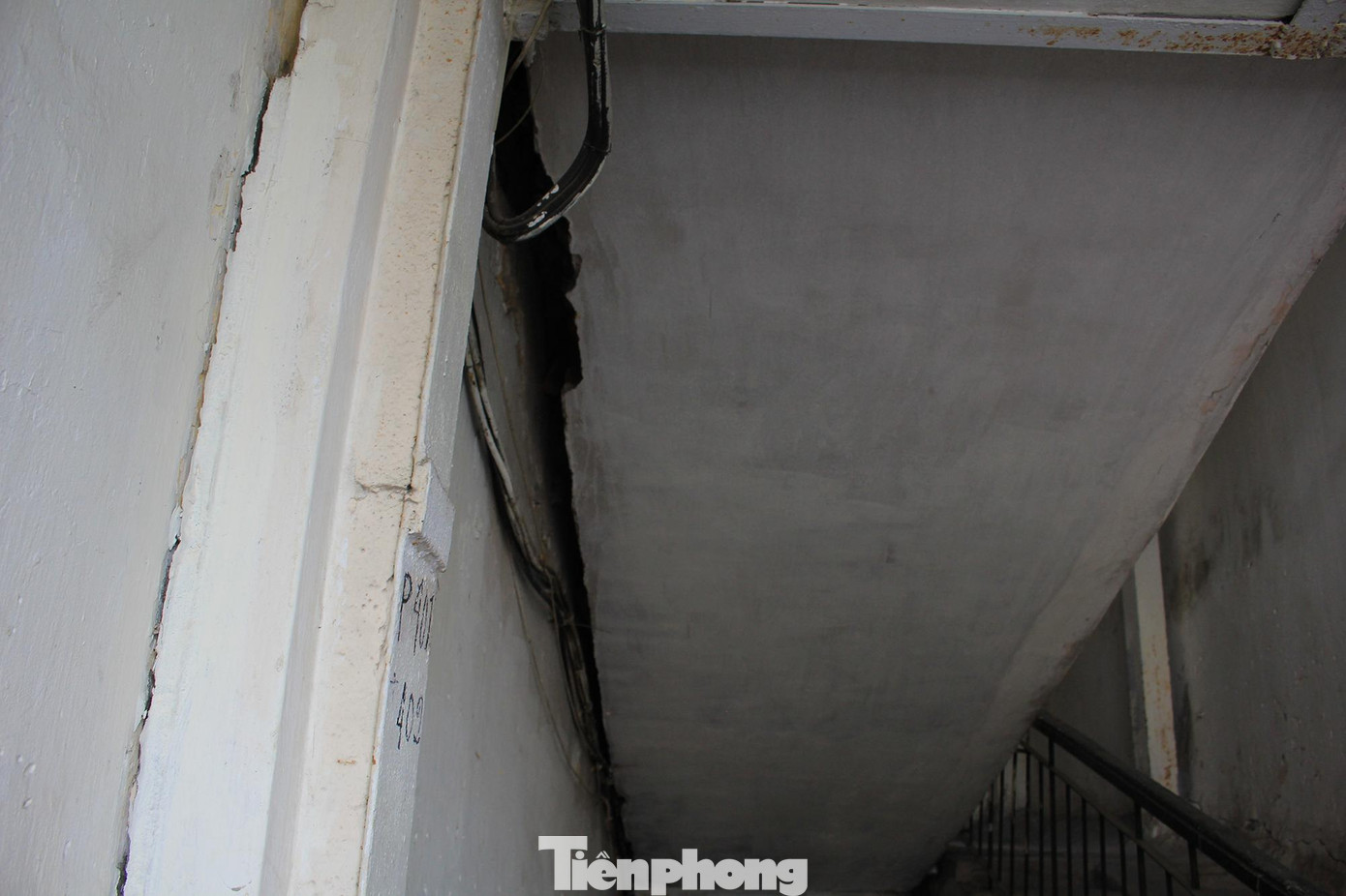 | Theo ghi nhận của PV, một số khu vực tại nhà C8 tập thể Giảng Võ đã xuống cấp nghiêm trọng, nhiều nơi tường và trần nhà đã nứt toác trong khi sàn sụt lún nghiêm trọng. |