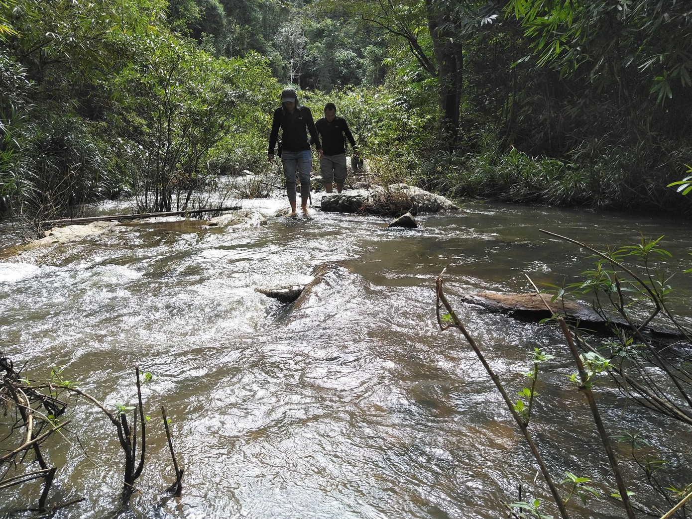 Để vào hiện trường nhóm phóng viên cùng lực lượng bảo vệ rừng phải đi qua nhiều khe suối đá lởm chởm, rất nguy hiểm