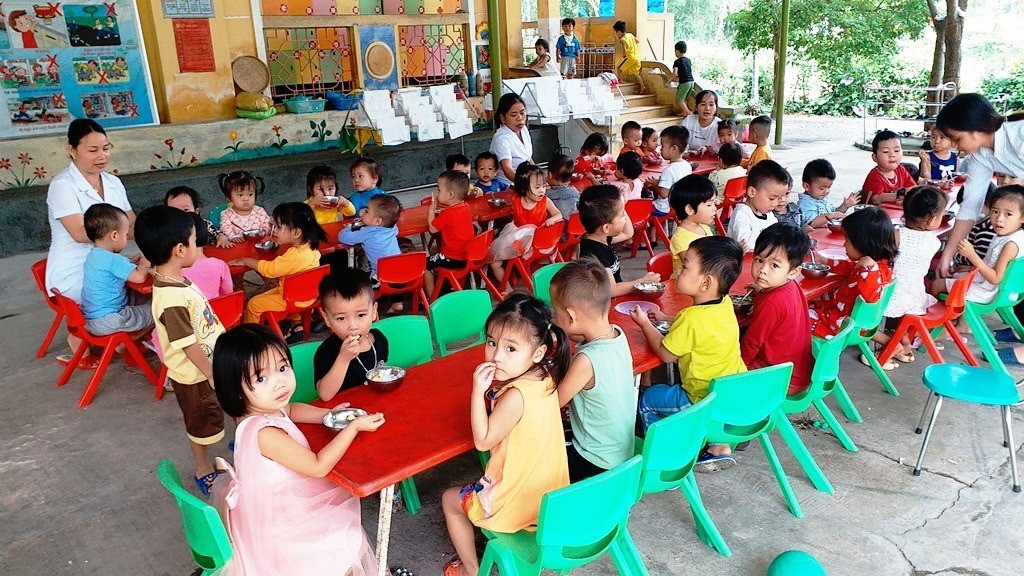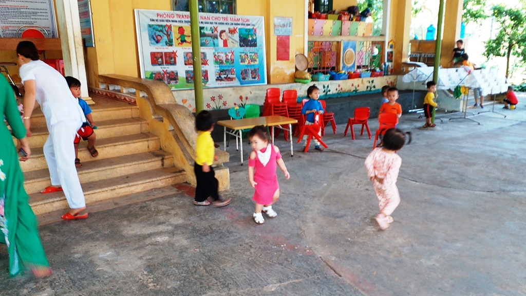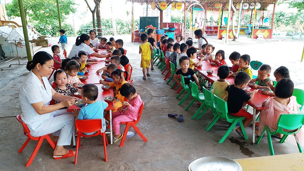 Trẻ phải thường xuyên ra ăn cơm ở sân trường vì điều kiện cơ sở vật chất thiếu thốn của trường