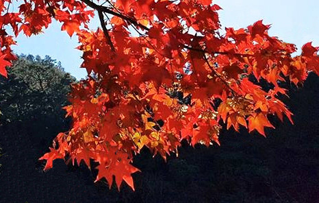 Những chiếc lá lìa cành rơi theo làn gió nhẹ thật lãng mạn. khi rơi rụng, lá phong vẫn giữ được màu đỏ tươi, nổi bật giữa màu xanh của cây lá rừng nguyên sinh. Một quần thể cây phong khác đã được các “phượt thủ” phát hiện tại Vườn quốc gia Bidoup - Búi Bà, cách thành phố Đà Lạt khoảng 50km. Phong ở đây “già” hơn bên hồ Tuyền Lâm, một số cây cao tới 20m, trên cây có nhiều loài hoa và địa y sống cộng sinh rất độc đáo. Trong ảnh: Nhành phong lá đỏ duyên dáng: ..