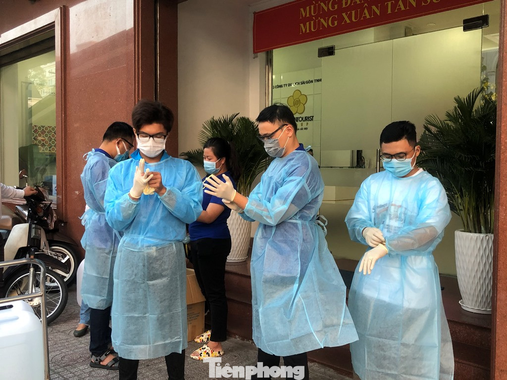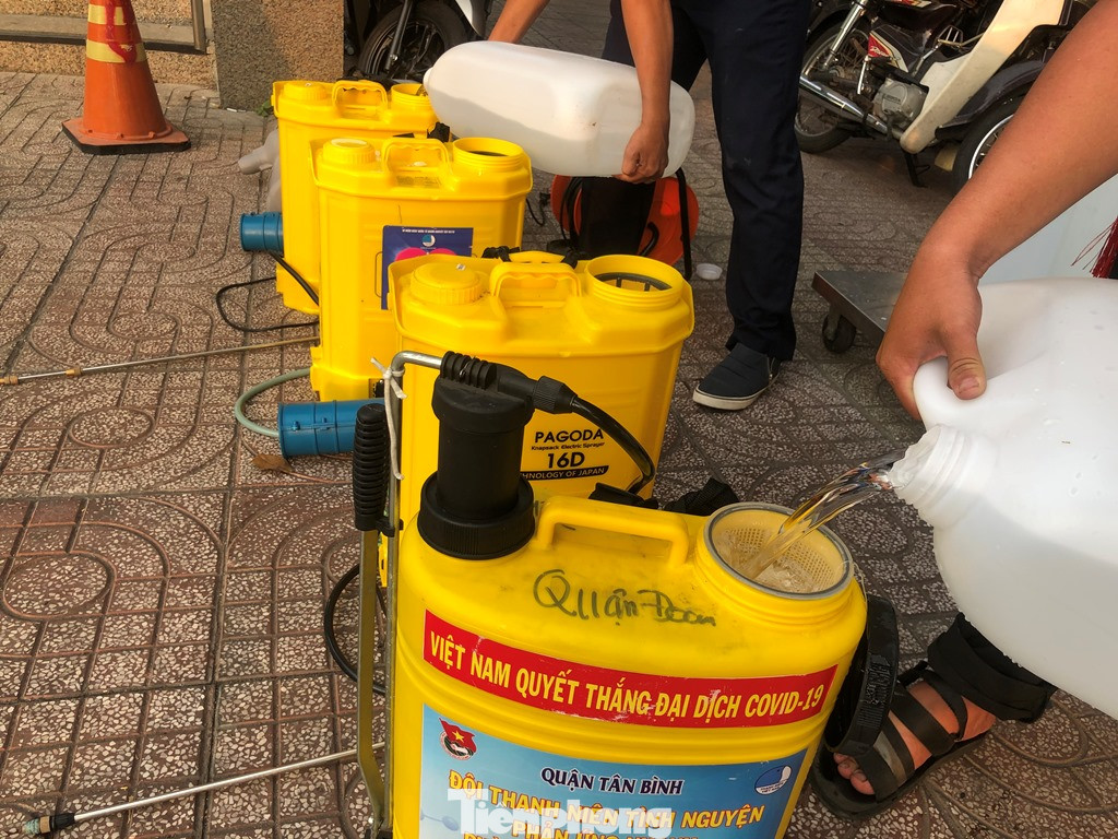Đội hình gồm 9 thành viên. Mọi người tập trung lúc 17h để chuẩn bị dung dịch và mặc đồ bảo hộ. Quá trình phun khử kết thúc sau 18h mỗi ngày.