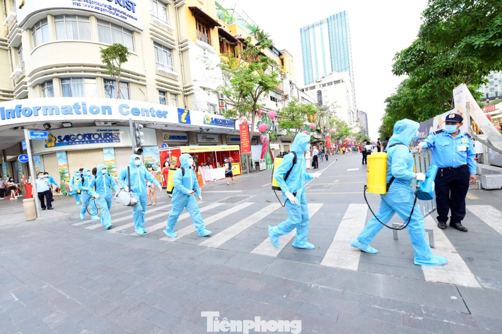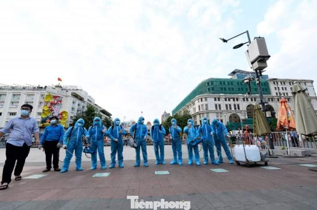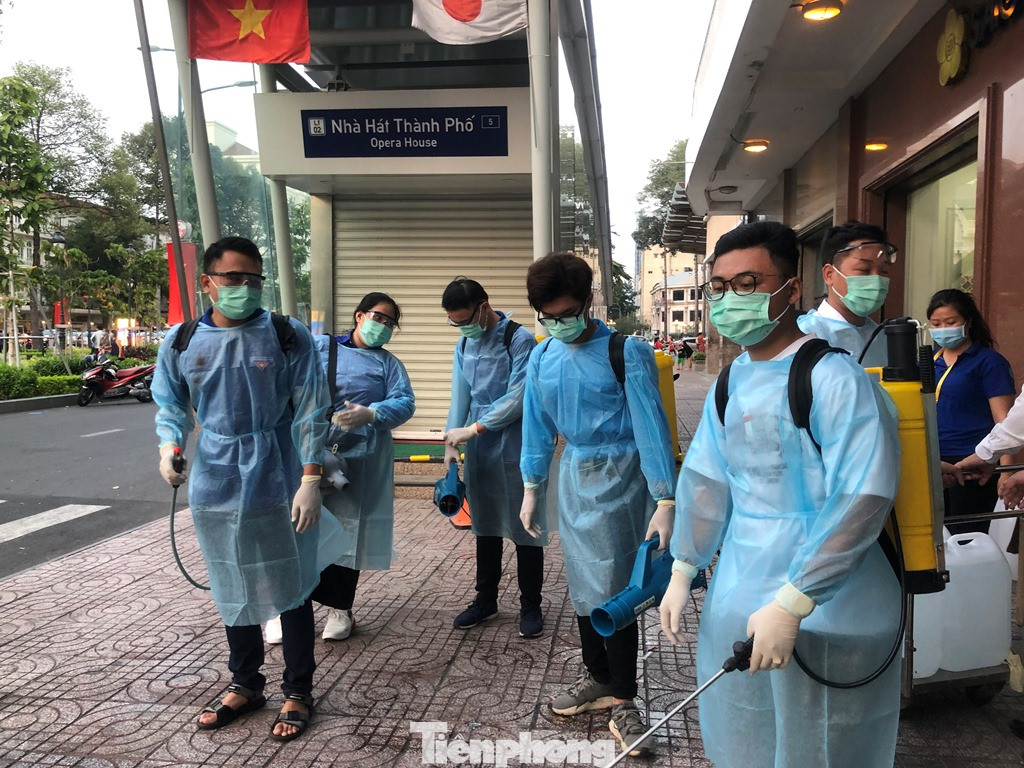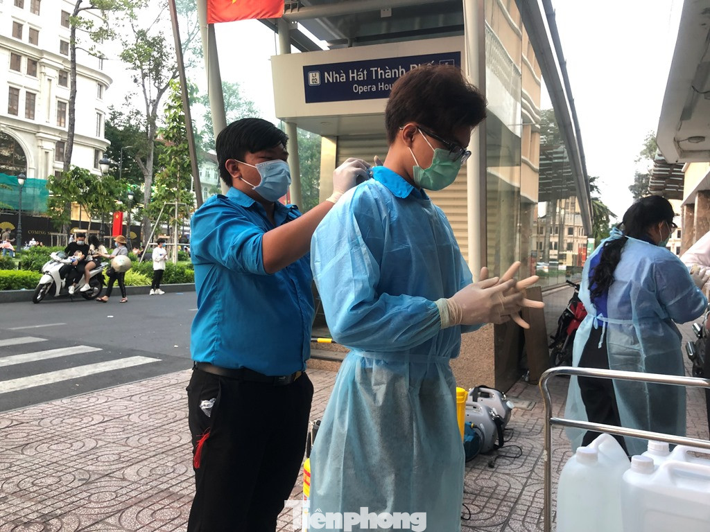 Tầm 17h mỗi ngày, các bạn đoàn viên sẽ có mặt để thực hiện nhiệm vụ phun khử khuẩn đường hoa Nguyễn Huệ phòng bệnh COVID-19. Bạn Nguyễn Văn Lành, CTV Thành đoàn TPHCM (bìa phải), chịu trách nhiệm hướng dẫn đội phun xịt.