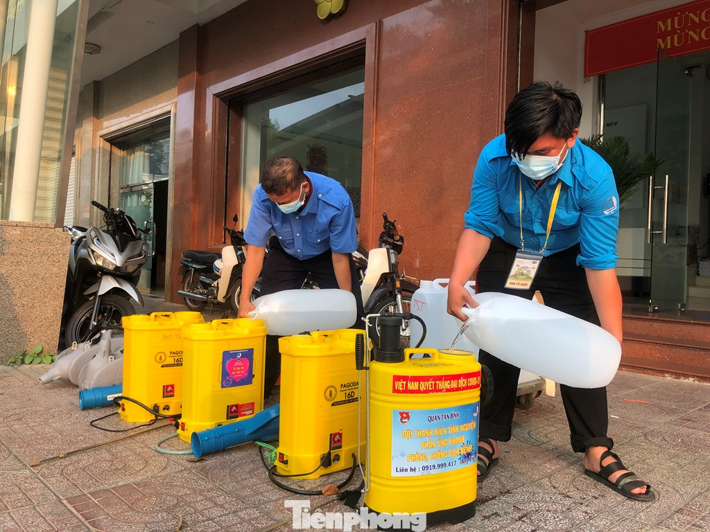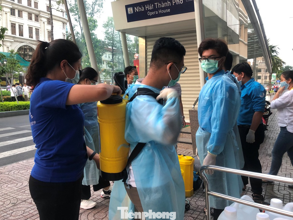 Bạn Lành cho biết, mỗi ngày sẽ có một quận Đoàn phụ trách. Hôm nay các bạn đoàn viên ở quận Đoàn quận 10 sẽ thực hiện nhiệm vụ. Dung dịch được dùng để khử khuẩn là Cloramin-B.