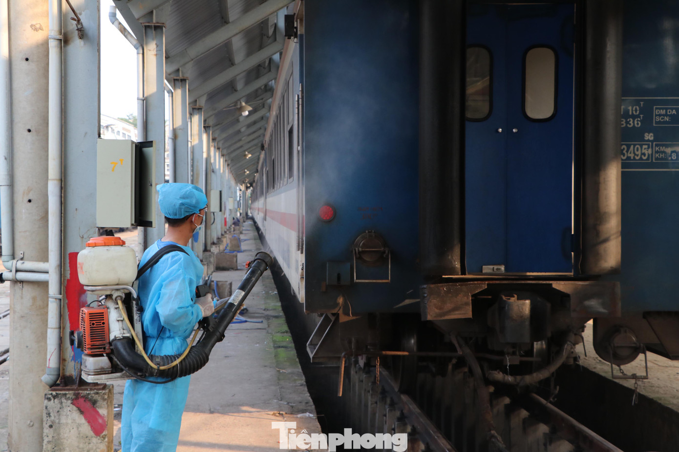 Để đảm bảo an toàn cho hành khách đi tàu hỏa, ga Sài Gòn tiến hành khử trùng tất cả các đoàn tàu trước khi đón khách.