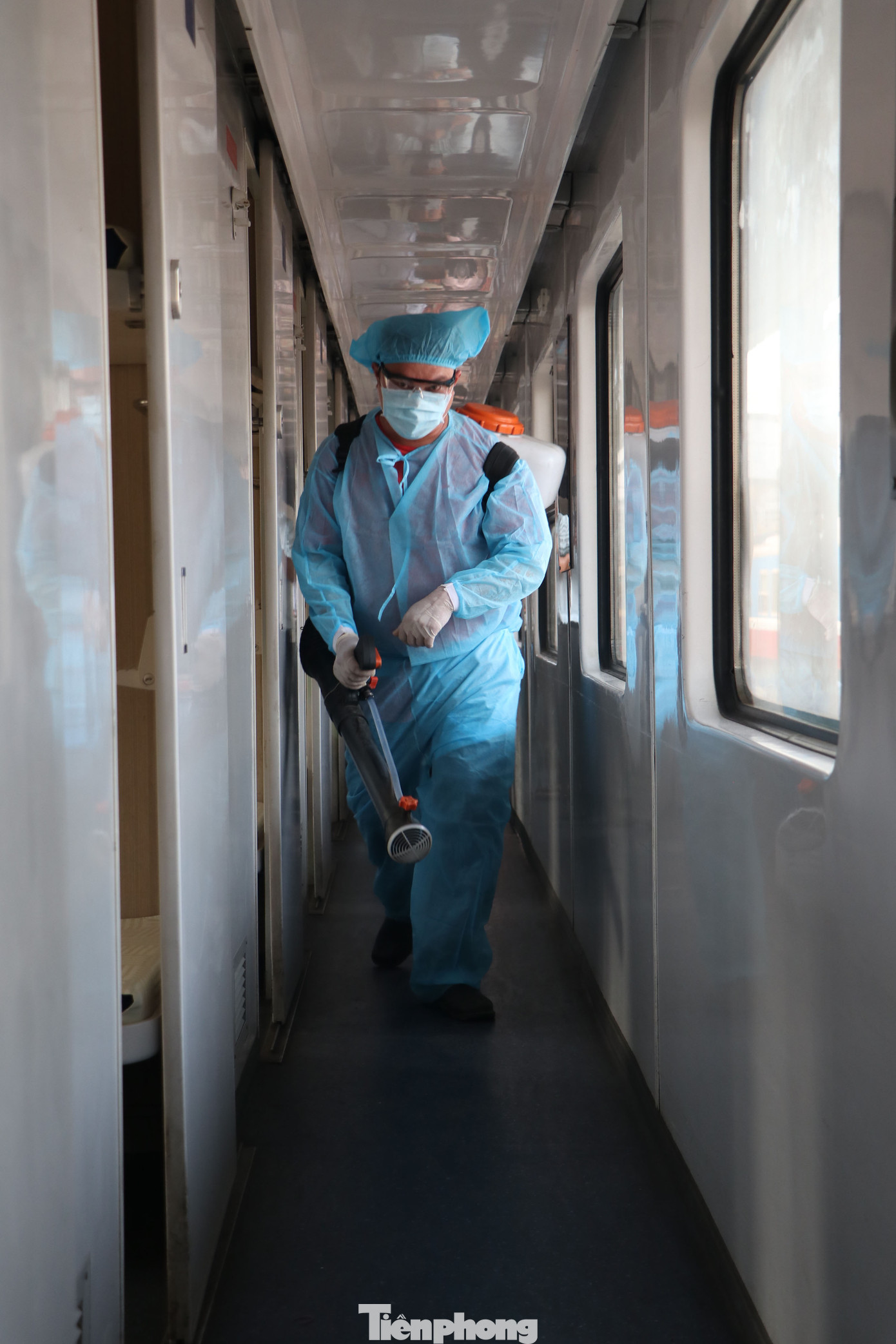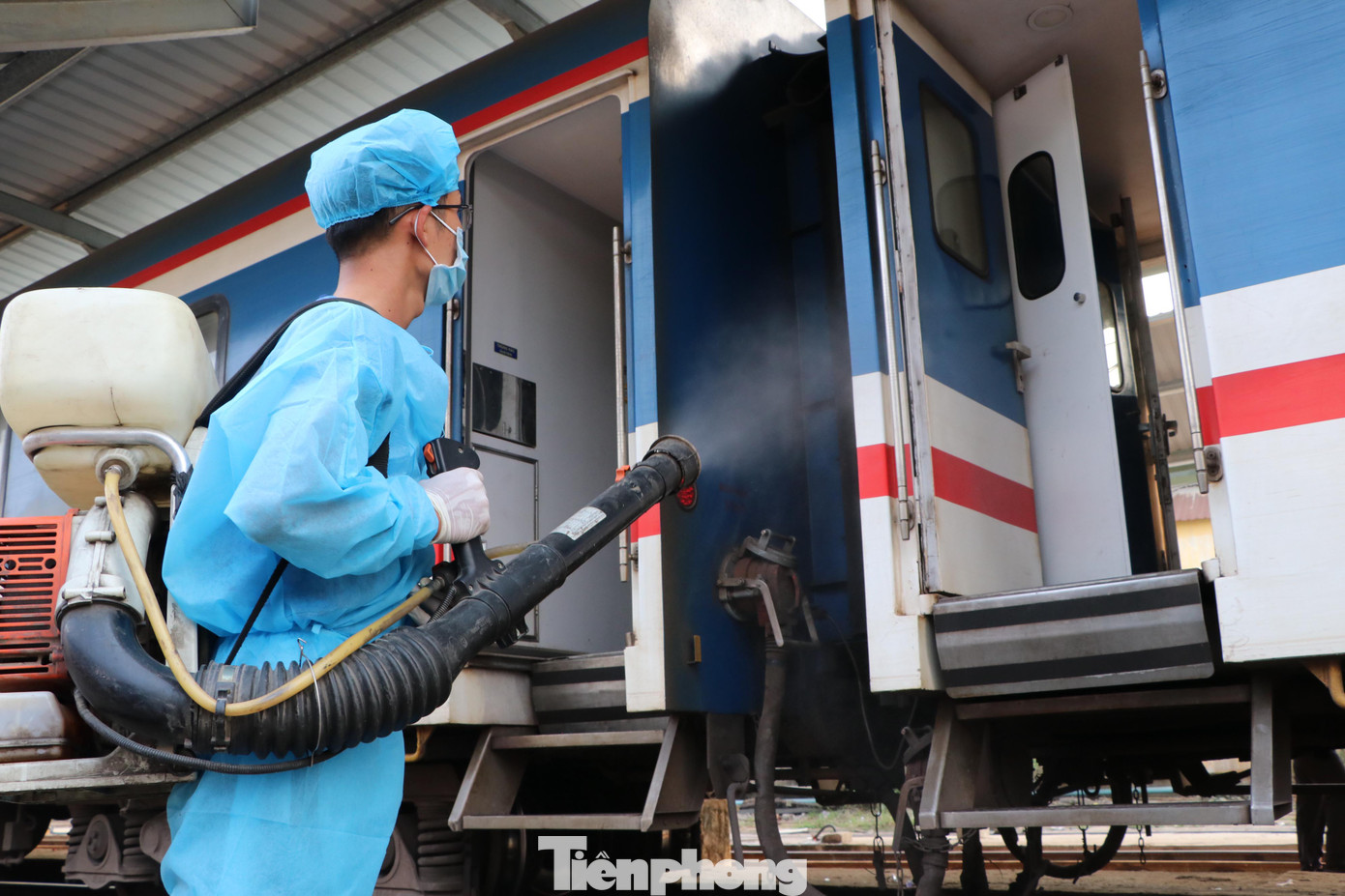 Không chỉ phun thuốc khử trùng bên trong các toa chở khách, nhân viên kiểm dịch cũng phun thuốc bên ngoài đoàn tàu.