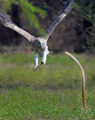 Hổ mang bạnh cổ, rướn cao thân mình và tấn công đại bàng một cách điên cuồng để tìm đường sống.