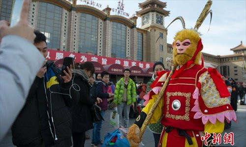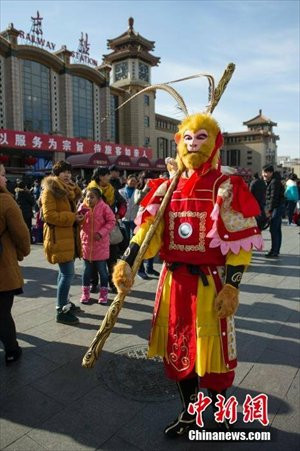 Cậu sinh viên của Học viện điện ảnh Bắc Kinh mặc trang phục giống hệt Tôn Ngộ Không, vác “cây gậy Như Ý” và bao đồ đứng xếp hàng mua vé tàu về quê (tỉnh Hà Nam) ăn Tết.