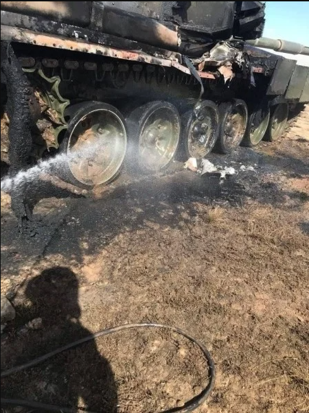 Sườn bên phải của cỗ tăng chiến đấu chủ lực T-90A của Nga bị cháy đen thui