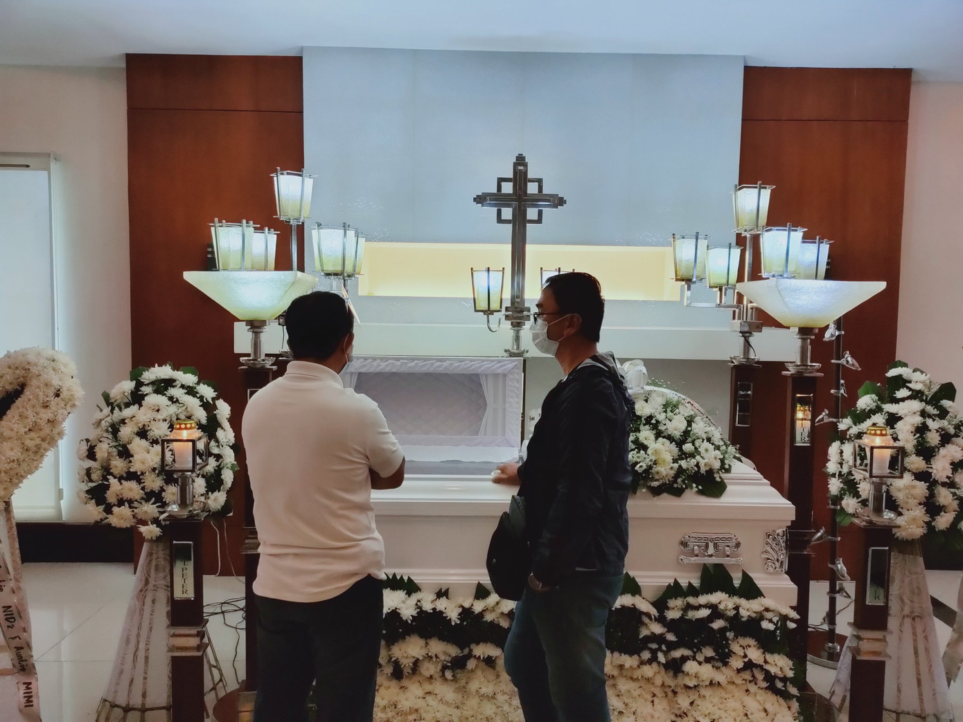Nhà tang lễ được phủ trắng, với lác đác vài người có mặt.