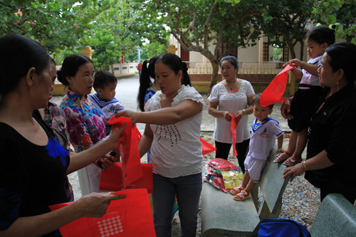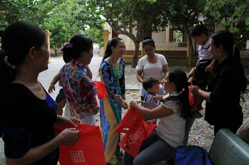 | Phóng viên báo Tiền Phong (phải) trao quà cho đại diện các hộ dân có trẻ em trên đảo Song Tử Tây. |