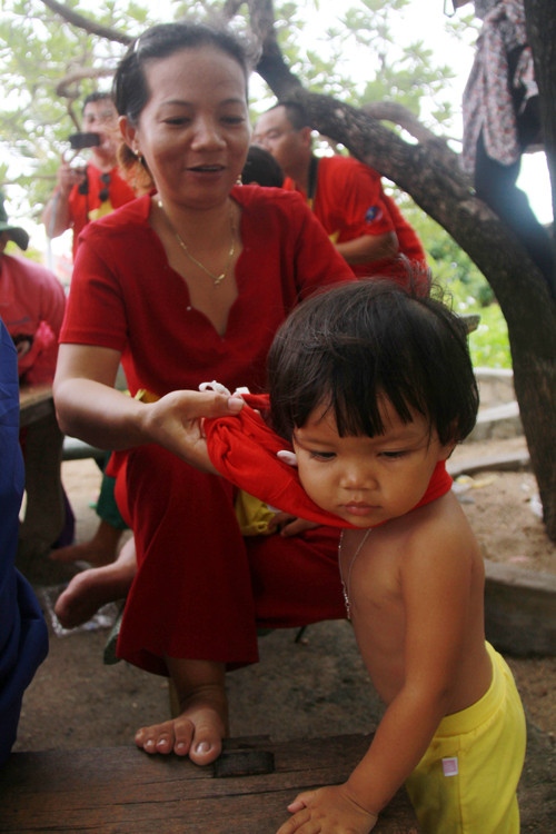 | Các bậc phụ huynh trên đảo Sinh Tồn chia quần áo cho các cháu nhỏ. |