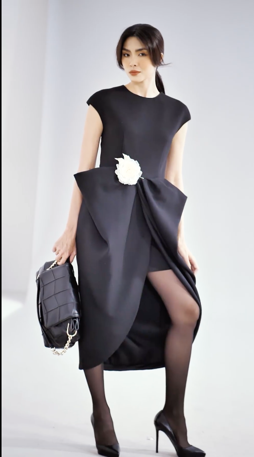 Có khi người đẹp lại mang đến hình ảnh quyến rũ với chiếc đầm hở vai, thắt eo điểm xuyết hoa trắng tương phản giúp trang phục nổi bật hơn.