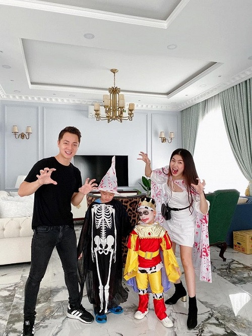 Vợ chồng ca sĩ Đăng Khôi hóa trang cùng các con trong ngày Halloween.