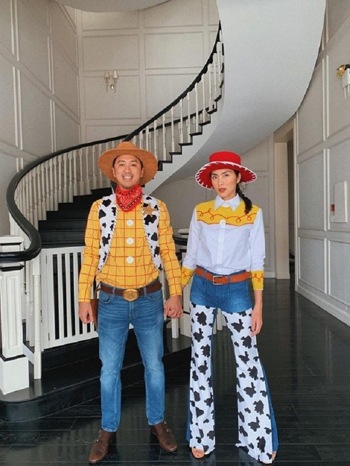 Tăng Thanh Hà cùng ông xã Louis Nguyễn gây thích thú khi hóa trang thành cao bồi miền Tây trong bộ đồ ton-sur-ton.
