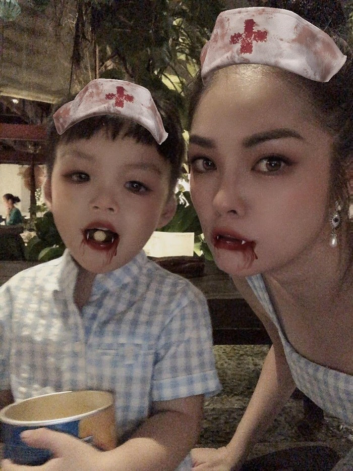 Dương Cẩm Lynh và con trai sử dụng app điện thoại hưởng ứng Halloween.