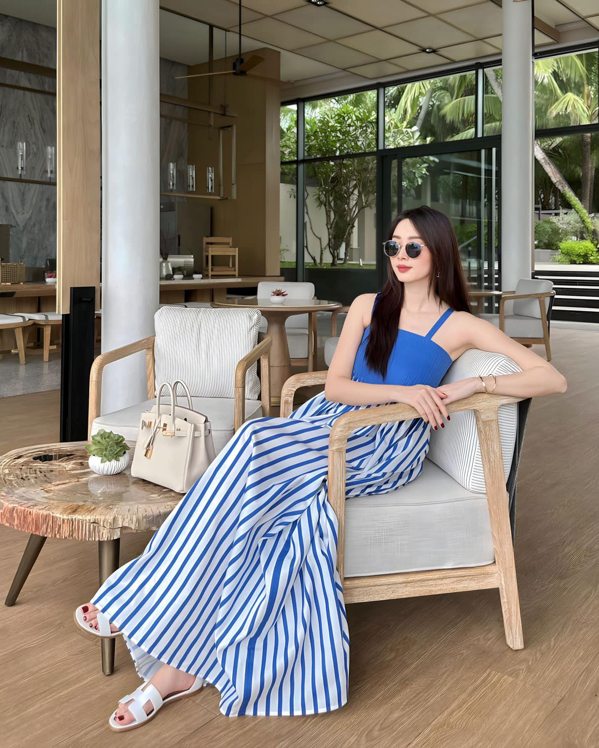 Hoặc bộ váy đầy nữ tính màu tím này cũng giúp Đặng Thu Thảo càng thêm dịu dàng, ngọt ngào giữa khu nghỉ dưỡng sang chảnh.