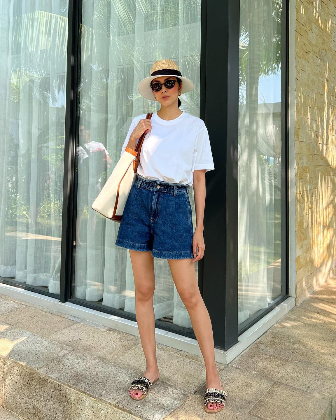 Style yêu thích khác của ngọc nữ màn ảnh Việt là những set đồ khỏe khoắn. Cô thích kết hợp áo thun cùng quần soóc, vừa năng động, mát mẻ mà vẫn đủ thoải mái để chơi đùa cùng các con.