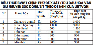 Tại tờ trình, Chính phủ đề nghị UBTVQH điều chỉnh tăng mức thuế BVMT đối với xăng từ 1.000 đồng/lít lên 3.000 đồng/lít (tăng 2.000 đồng/lít). Mức thuế BVMT đối với nhiên liệu bay, dầu các loại và mỡ nhờn cũng sẽ tăng gấp 3 lần. Chính phủ đề nghị nguồn thu này để ngân sách trung ương thống nhất quản lý. Theo tính toán,  điều chỉnh biểu thuế xăng dầu sẽ góp phần tăng thu cho ngân sách khoảng 13-14 nghìn tỷ đồng. Nếu thông qua việc tăng thuế BVMT, Chính phủ sẽ xem xét giảm thuế nhập khẩu xăng dầu từ 35% xuống còn 25%, để bảo đảm giá bán lẻ xăng dầu không ảnh hưởng đến người tiêu dùng.