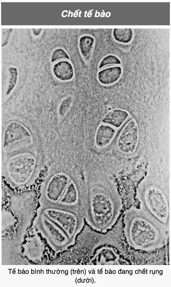 “Chết theo chương trình” (apoptosis) là quá trình tế bào chết rụng phân rã thành các cấu trúc gọi là tiểu thể chết rụng. Các tiểu thể này sẽ bị thực bào xung quanh tiêu hóa trước khi các thành phần bên trong tế bào có thể tràn ra ngoài và gây hư hại cho các tế bào khác.
