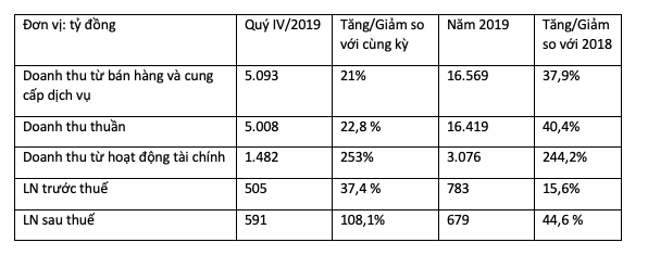 Tính riêng trong quý IV/2019, FLC đạt gần 5.093 tỷ đồng doanh thu từ bán hàng và cung cấp dịch vụ, tăng 21% so với cùng kỳ năm trước. Mặc dù giá vốn tăng cao nhưng với doanh thu từ hoạt động tài chính tăng mạnh lên 1.482 tỉ đồng, lợi nhuận sau thuế của doanh nghiệp ghi nhận trong riêng 3 tháng cuối năm lên tới gần 591 tỷ đồng, gấp đôi so với cùng kỳ.