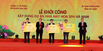Trong chương trình lễ khởi công Nhà máy tại Hà Nam, Hoa Sen đã trao tặng bò trị giá 1,5 tỷ đồng cho các hộ nghèo tỉnh Hà Nam; tặng 50 chiếc xe đạp cho học sinh nghèo hiếu học; đồng hành và trao tặng 2 chương trình Vượt lên chính mình đến 2 hộ dân tỉnh Hà Nam; đồng hành cùng chương trình Lục lạc vàng trao tặng 24 con bò đến 12 hộ dân tỉnh Hà Nam.