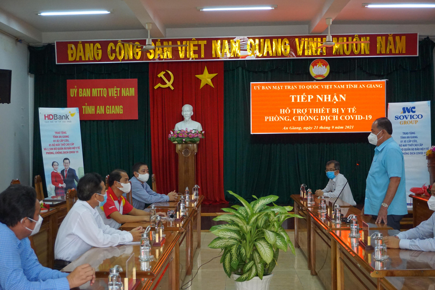 Ông Huỳnh Thanh Giang, Giám đốc HDBank An Giang, cho biết dịp này, Tập đoàn Sovico và HDBank trao tặng tỉnh An Giang các trang thiết bị y tế hiện đại, với mong muốn địa phương có đầy đủ phương tiện, thiết bị hơn để phục vụ cho công tác phòng chống dịch, mang đến sự an tâm cho bà con trong tỉnh.