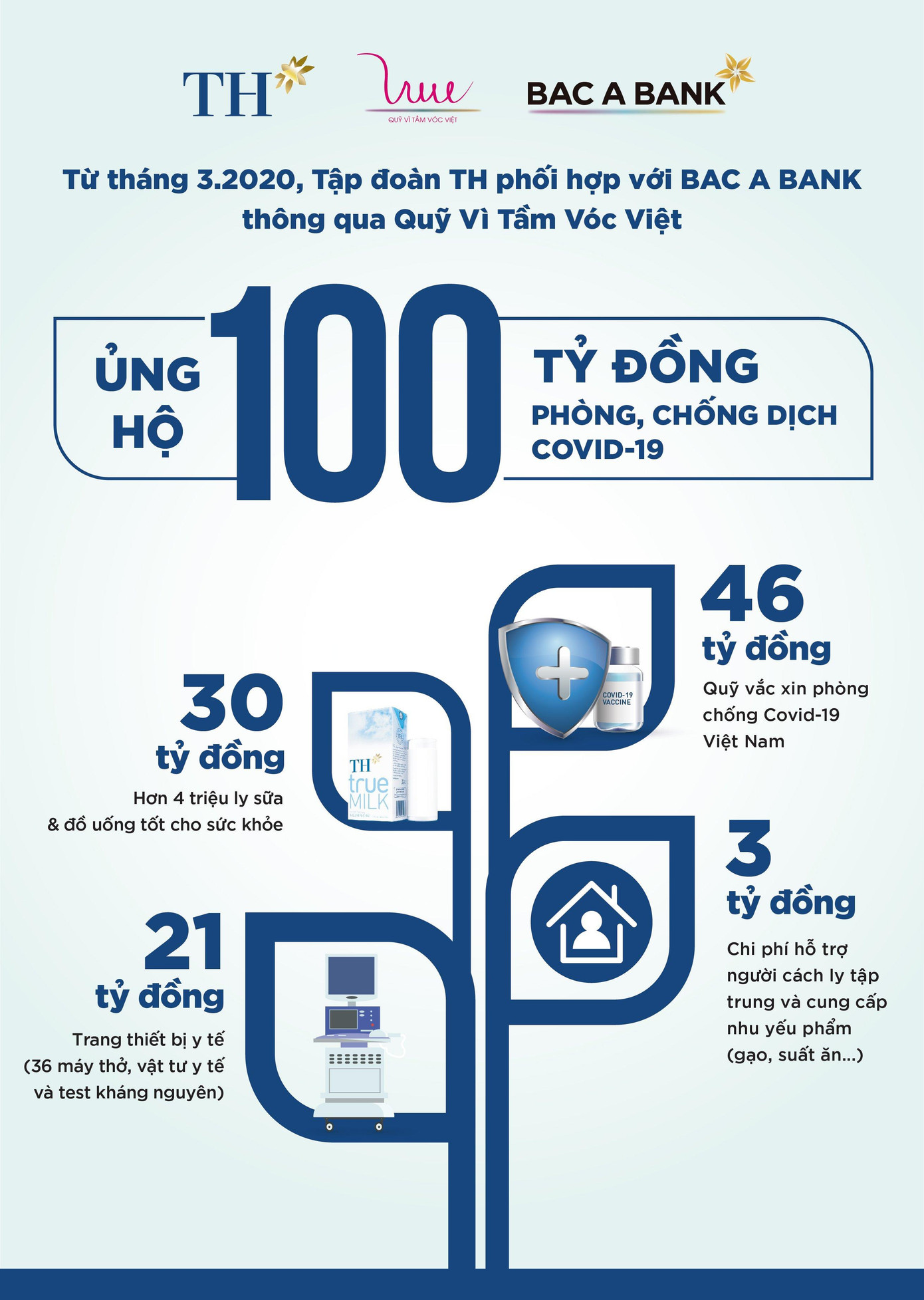 Từ 3/2020 tới nay, khi dịch Covid bùng phát và tái bùng phát, tập đoàn TH, ngân hàng TMCP Bắc Á thông qua Quỹ Vì tầm vóc Việt đều có mặt tại các điểm nóng trao tặng sản phẩm, các trang thiết bị y tế và nhu yếu phẩm.Trong đó, khi dịch bùng phát, 3 đơn vị cũng đã trao tặng 2 máy thở cao tần.Tổng trị giá các hoạt động trao tặng, ủng hộ phòng chống, điều trị bệnh nhân mắc Covid 19 của 3 đơn vị lên tới 100 tỷ đồng.