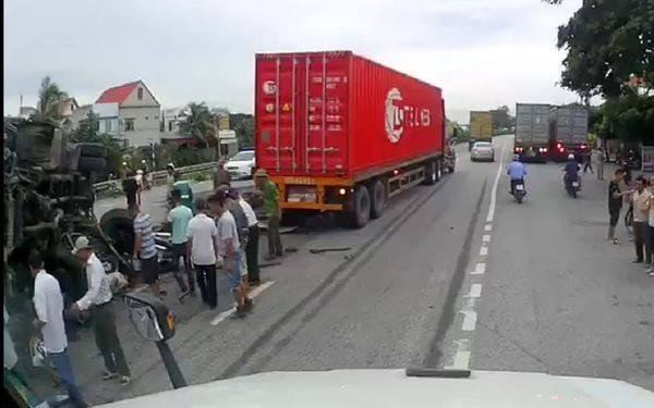 Tại hiện trường, xe tải chở nước bị lật đè lên các nạn nhân và xe máy. Ảnh: Facebook