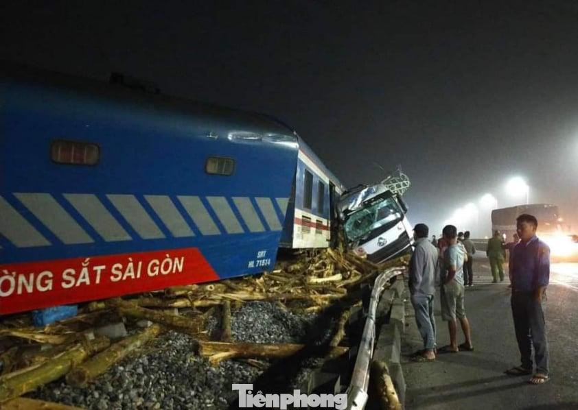 Phía ô tô tải cũng bị cuốn vào đường tàu, lật nghiêng và biến dạng phần thân trái. Toàn bộ hàng hoá trên thùng xe là các cây gỗ bị văng vào đường sắt.