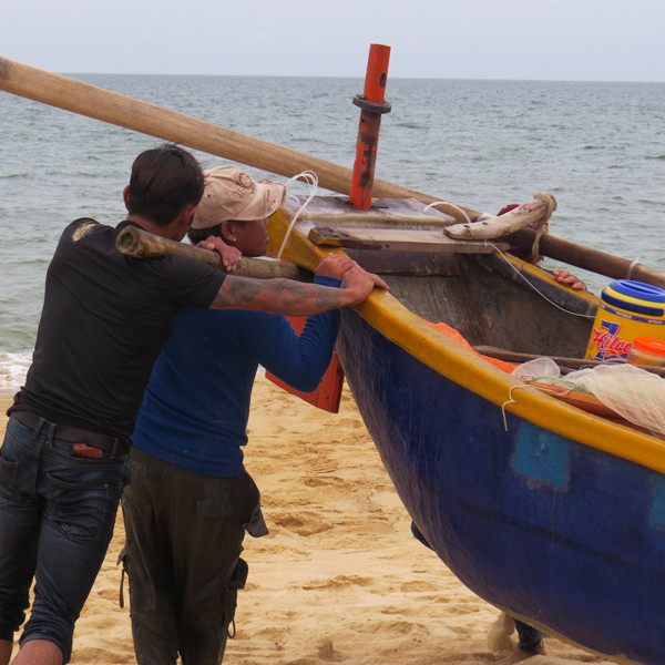 Đi dọc bờ vịnh Hòn La, tìm mãi chúng tôi mới bắt gặp được vài ngư dân Quảng Ngãi đang trụ lại ở đây để tìm cách trục vớt những chiếc tàu của mình bị chìm trong cơn bão trước.