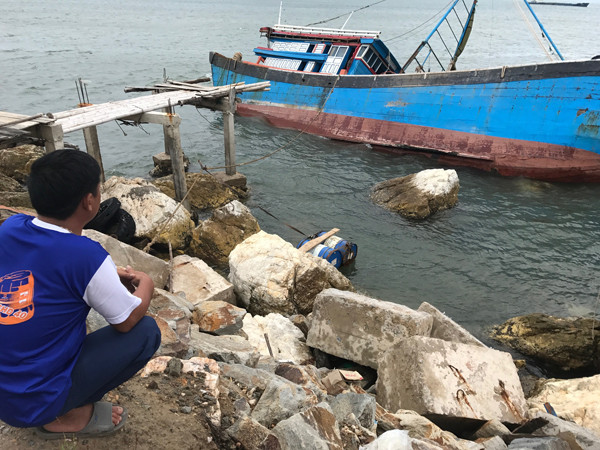 Ông Nguyễn Phụng, ngư dân đến từ Quảng Ngãi ngồi co ro trên bờ nhìn ra chiếc tàu cá nửa nổi, nửa chìm của mình than thở: “Tàu mà nằm kiểu này, bão vào, chỉ cần vài đợt sóng thì coi như tan tành”.