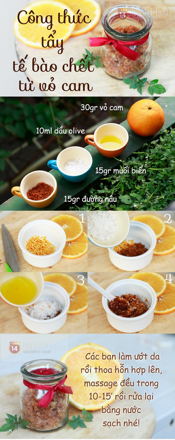 - Đường và muối biển sẽ giúp tẩy tế bào chết, dầu olive duy trì độ ẩm cho da. Bên cạnh đó, vỏ cam với hàm lượng vitamin C dồi dào sẽ cải thiện màu da, tái tạo collagen khiến da luôn săn chắc và tràn đầy sức sống.