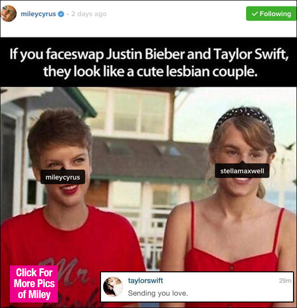 Miley còn thậm chí để lại một dòng status trêu chọc Taylor Swift khá hài hước rằng: "Nếu chúng ta hoán đổi khuôn mặt của Taylor và Justin thì trông họ thật giống một cặp đồng tính nữ đáng yêu".