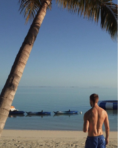 Xét về độ sexy, DJ nổi tiếng người Scotland không hề kém cạnh bạn gái. Trang phục bãi biển giúp anh anh khoe thân hình nóng bỏng với cơ bụng sáu múi. Chiều cao 1m96 không làm anh “thấp bé” trước bạn gái cao 1m78 như những bạn trai trước đây của cô.