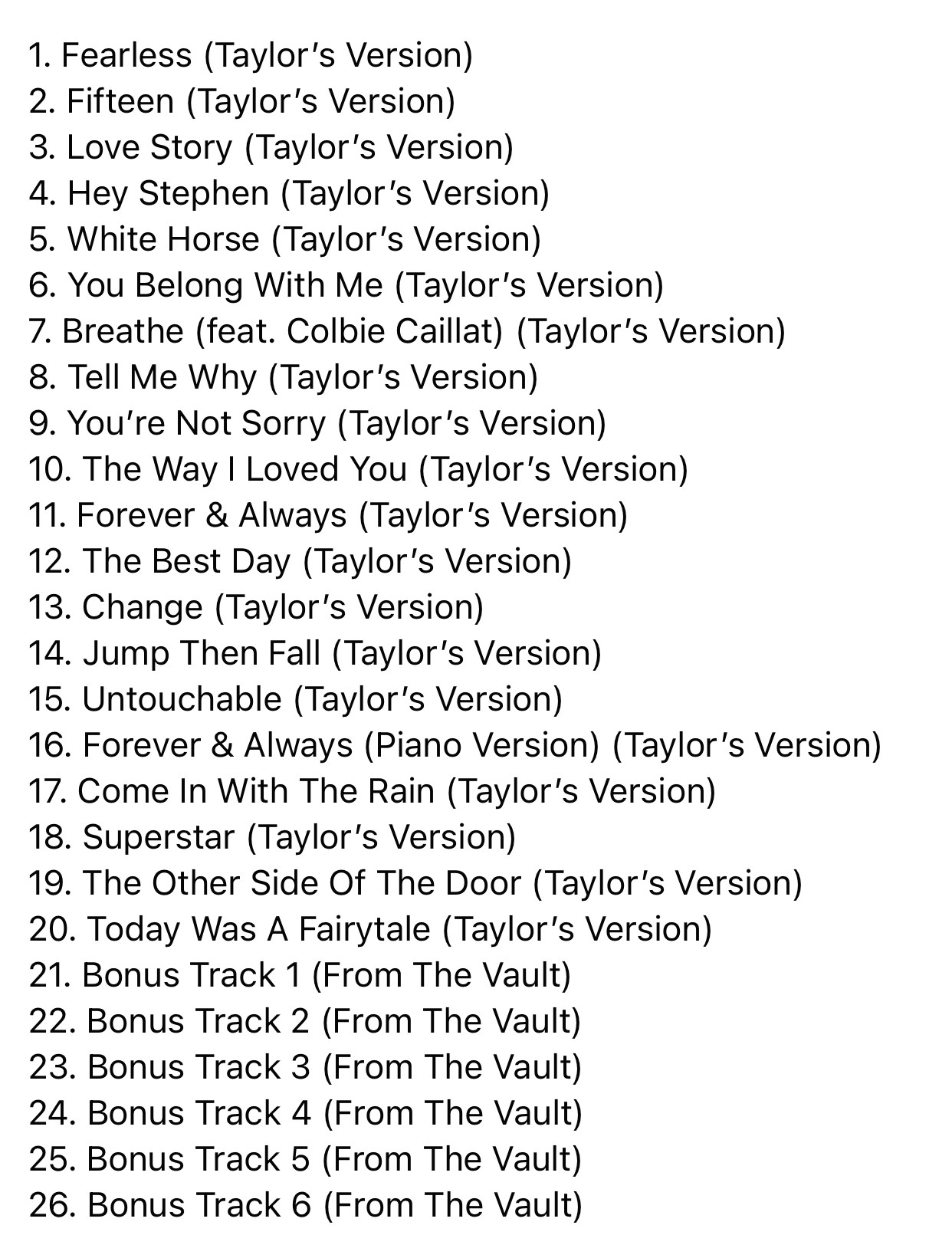 Bìa album FEARLESS TAYLOR’S VERSION (tạm dịch: FEARLESS phiên bản đến từ Taylor). Cụ thể trong đoạn tâm thư, chủ nhân của hit Blank Space đã bày tỏ, dù đã nhiều năm trôi qua, Taylor cùng người hâm mộ vẫn không thể quên được dấu ấn mà album FEARLESS để lại. Cô nàng đã quyết định “thổi hồn” vào những ca khúc cũ, hứa hẹn sẽ đem đến cho các Swifties những trải nghiệm âm nhạc hoàn toàn mới với hơn 26 ca khúc, trong đó có đến 6 ca khúc chưa từng được tiết lộ.