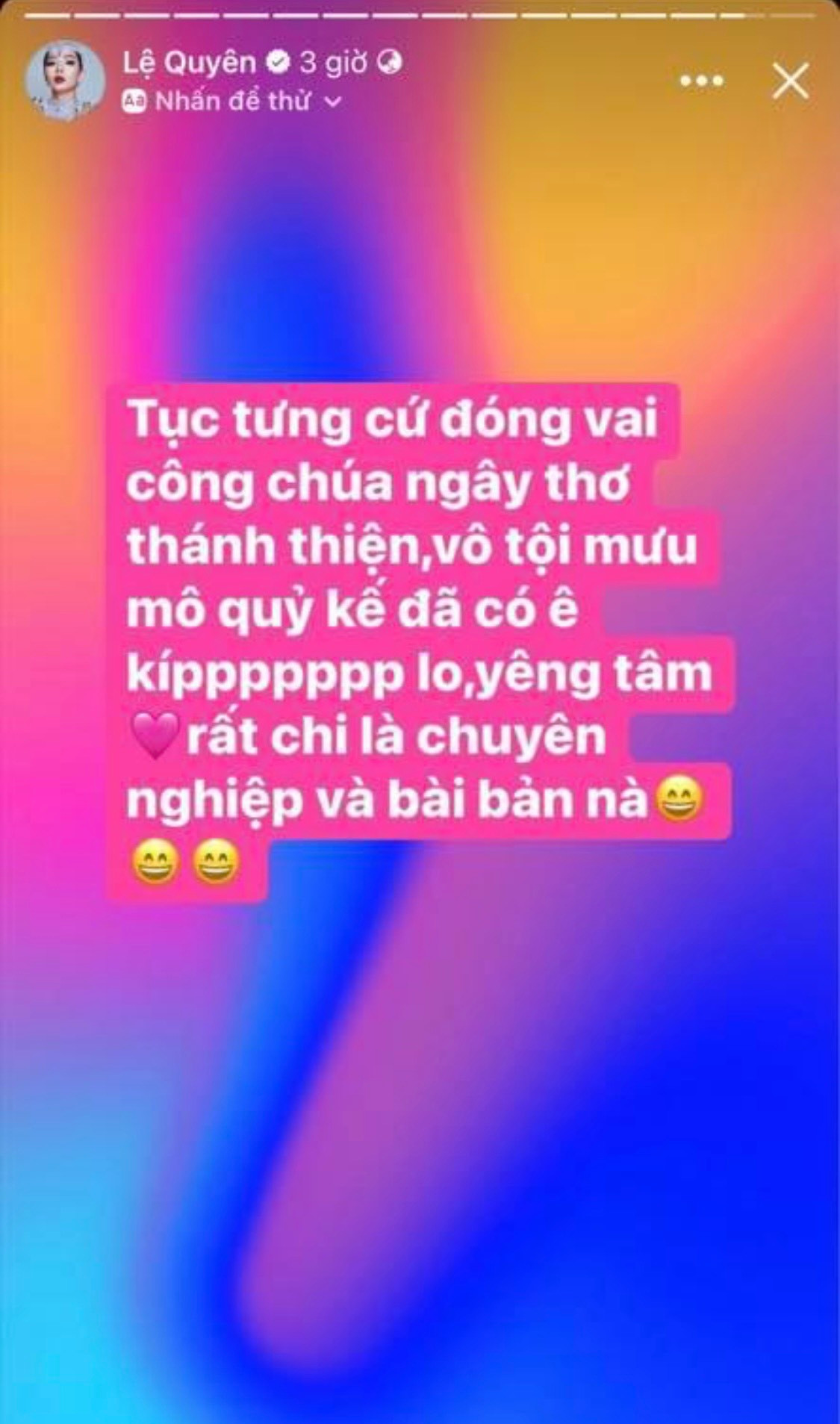 Trong lúc tranh cãi về lời bài hát chưa ngã ngũ, Lệ Quyên lại bất ngờ đăng tải lên Story Instagram những chia sẻ về một người em. "Cục cưng cứ đóng vai công chúa ngây thơ thánh thiện, vô tội. Mưu mô quỷ kế đã có ê-kíp lo, yên tâm. Rất chuyên nghiệp và bài bản". Story này lại tiếp tục gây "bão" mạng, nhiều khán giả cho rằng nữ ca sĩ đang ám chỉ những tên tuổi, sự kiện có mặt trong đêm Chung kết 1 vì bài đăng được post ngay khi tập 14 vừa lên sóng.