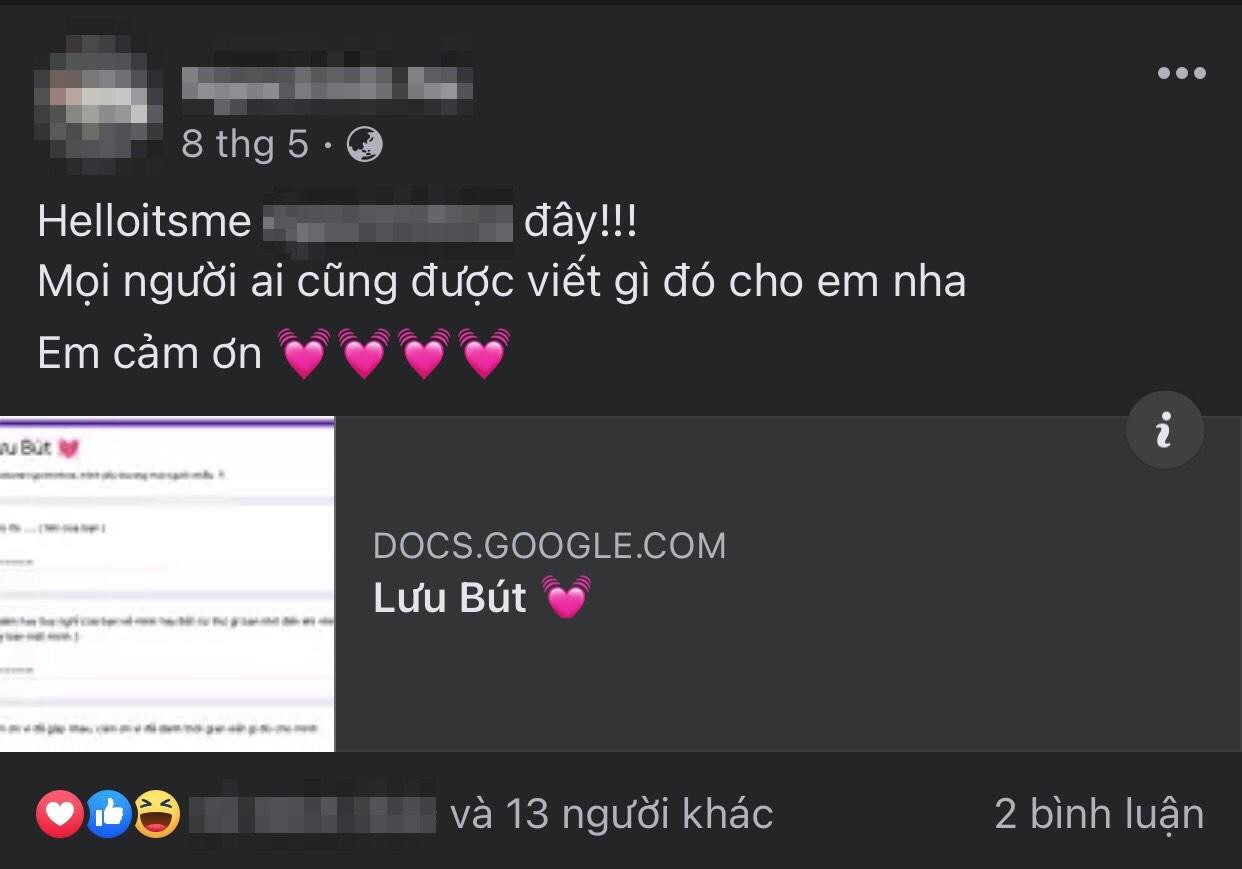 Bạn Thảo đã quyết định mở một form nhỏ để mọi người có thể viết những dòng tâm sự, những ấn tượng của mọi người về bản thân trong quãng thời gian 3 năm cấp Ba. Sau khi tổng hợp lại những dòng lưu bút của mọi người, cô bạn sẽ tự tay viết lại nó vào quyển sổ lưu bút khác, như một cách để gìn giữ lâu hơn kỷ niệm của thầy cô, bạn bè.