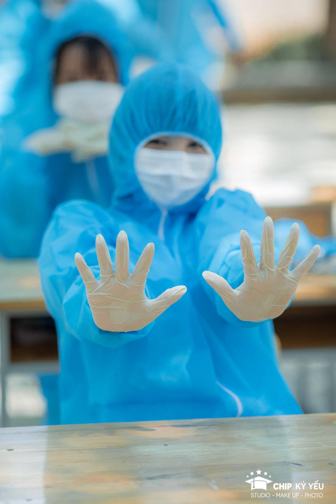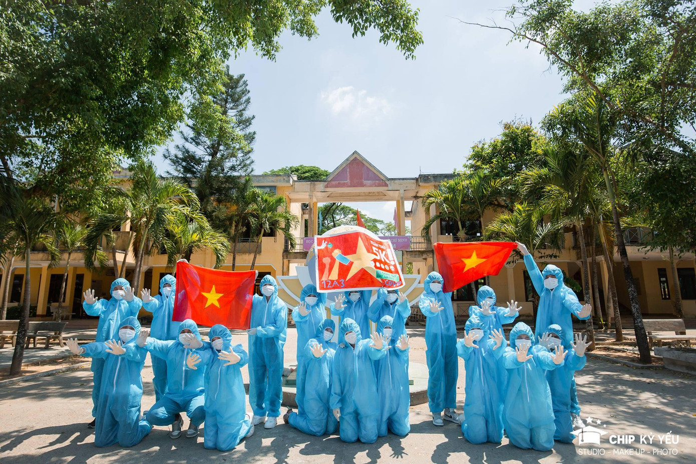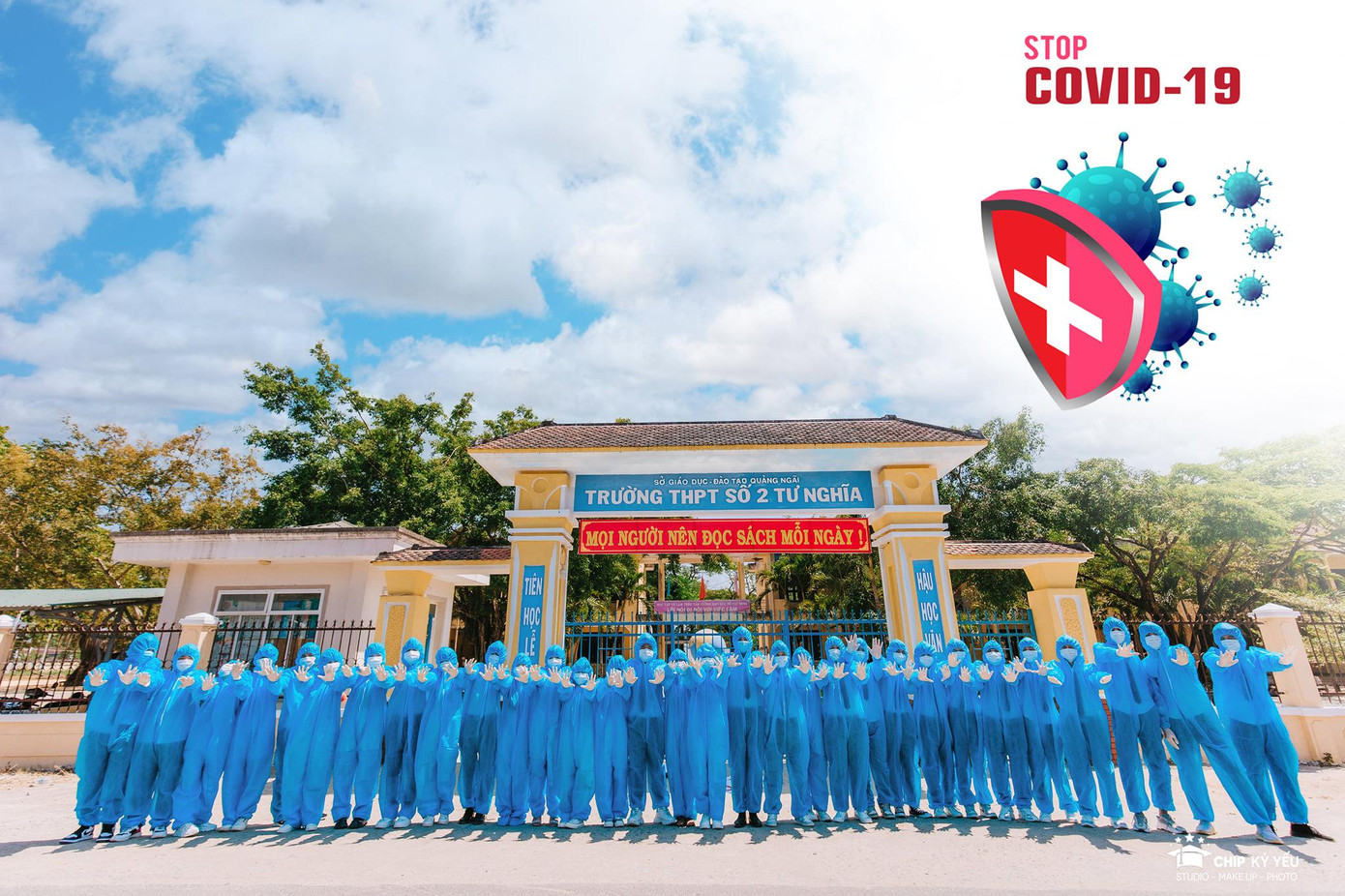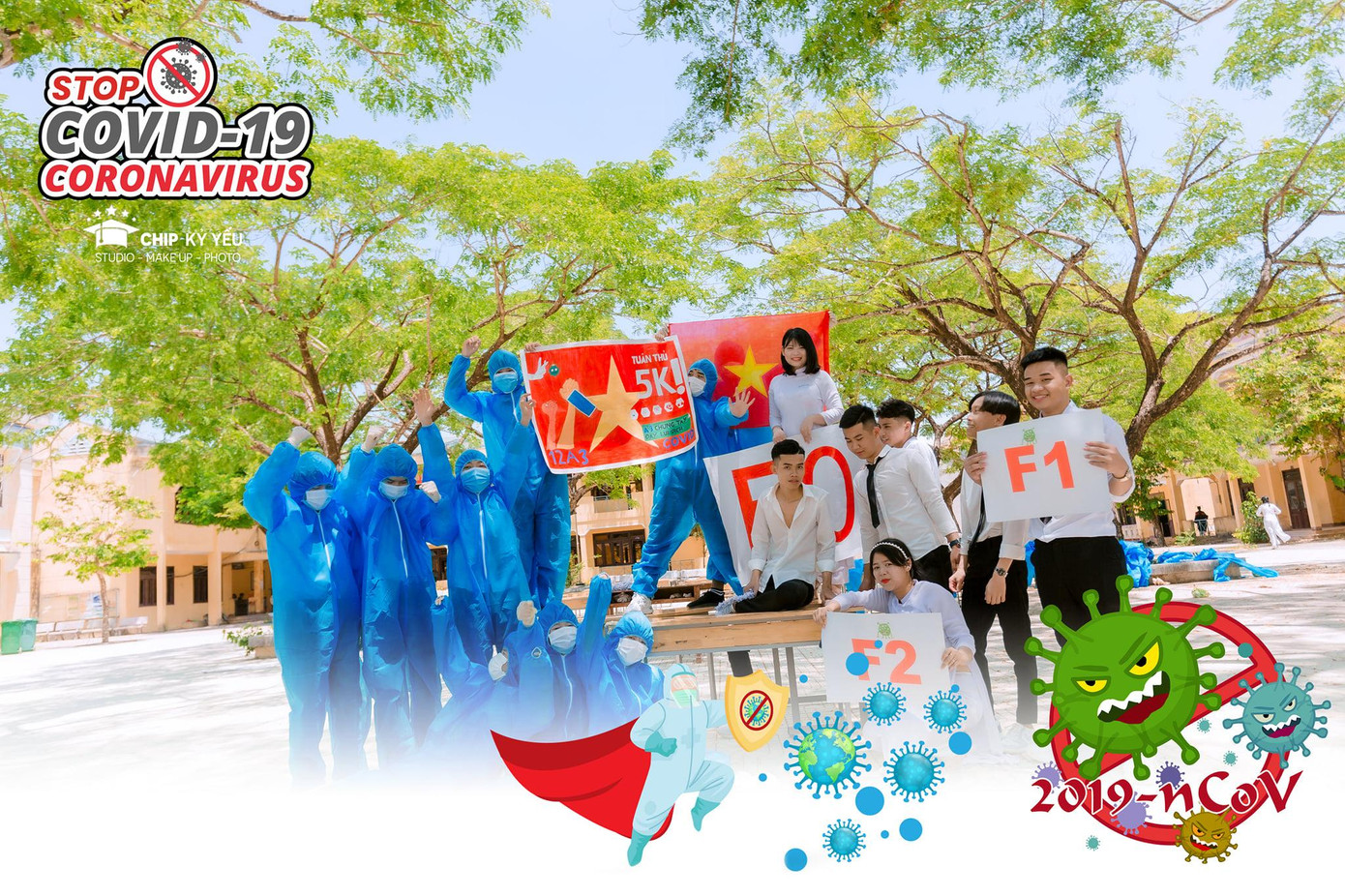 Cụ thể, tập thể lớp 12A3 trường THPT Số 2 Tư Nghĩa, Quảng Ngãi đã cùng nhau đưa ý tưởng phòng chống dịch COVID-19 vào bộ ảnh kỷ yếu của lớp mình. Các bạn đã tự chuẩn bị khẩu trang và quần áo bảo hộ cùng các tấm bảng khẩu hiệu thực hiện theo đúng khuyến cáo 5K của Bộ Y tế.
